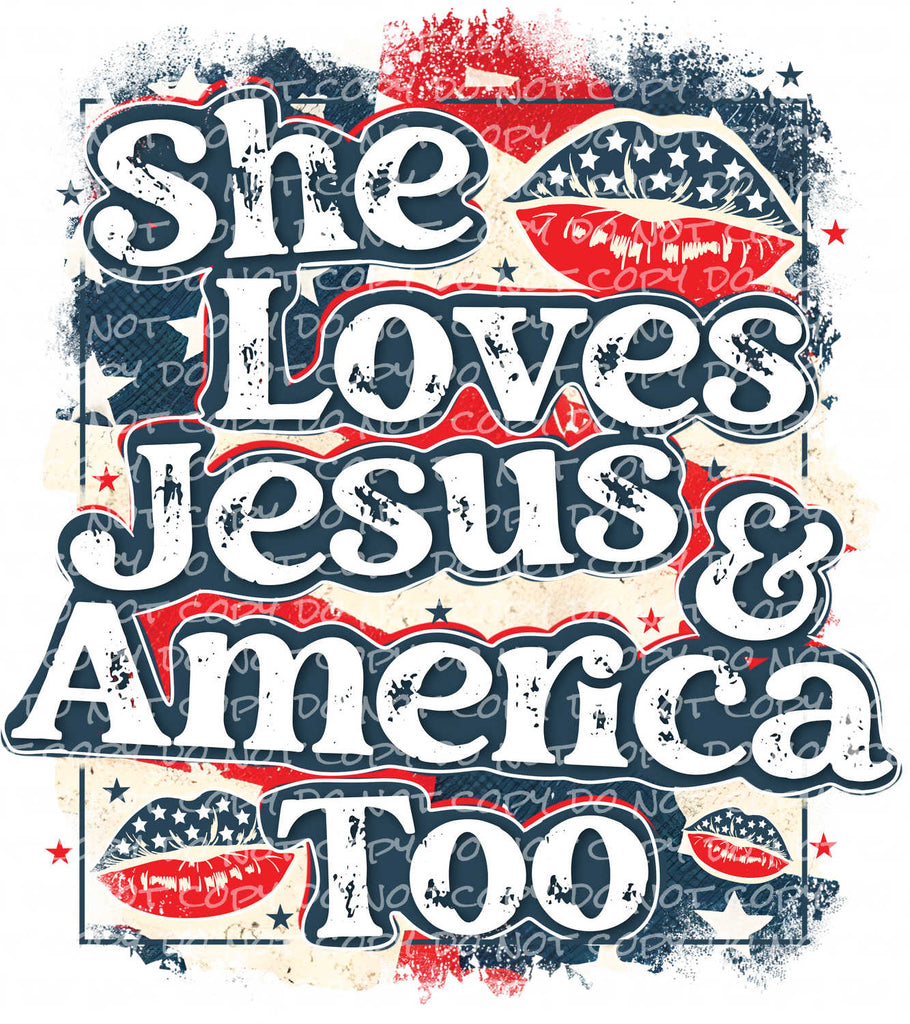 She Loves Jesus & America Too - DTF Ready to Press or Sublimation Transfer